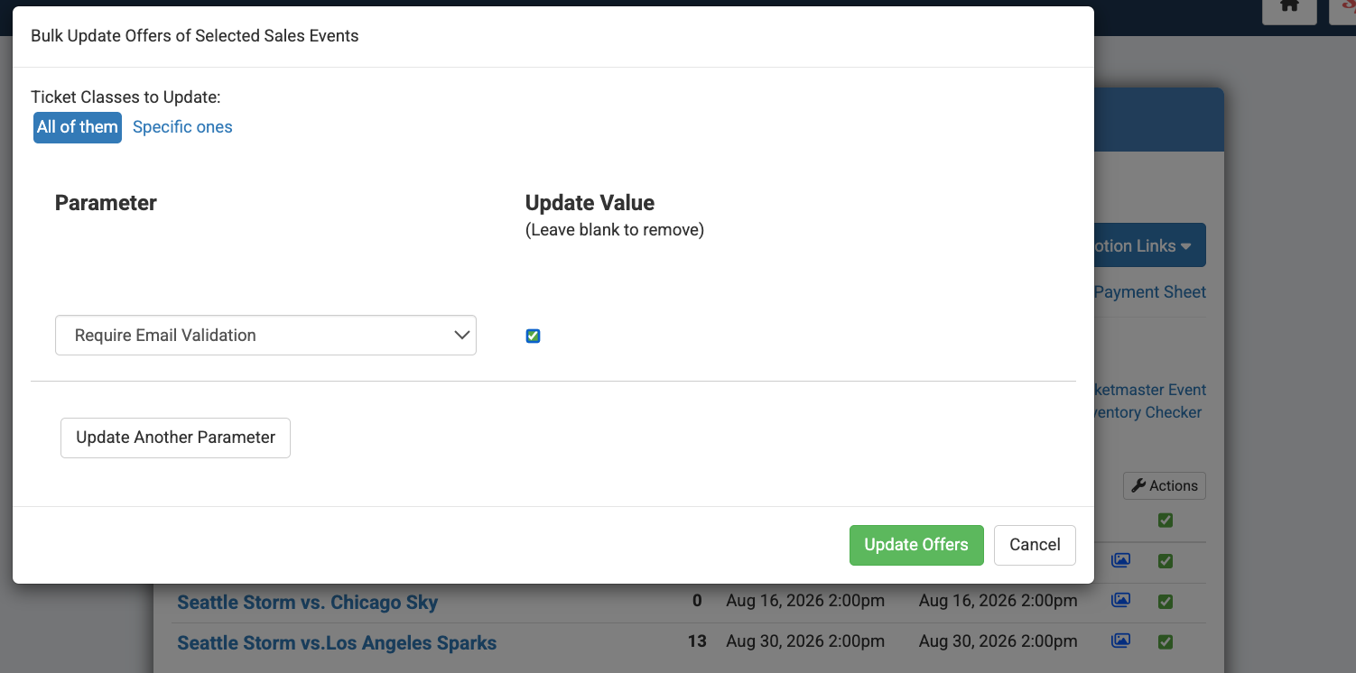 *Note: Be sure to enable this option for any offers or seating zones that would require email validation. If needed, the Bulk Update tool can also be used to apply this setting across multiple sales events or offers within the group.