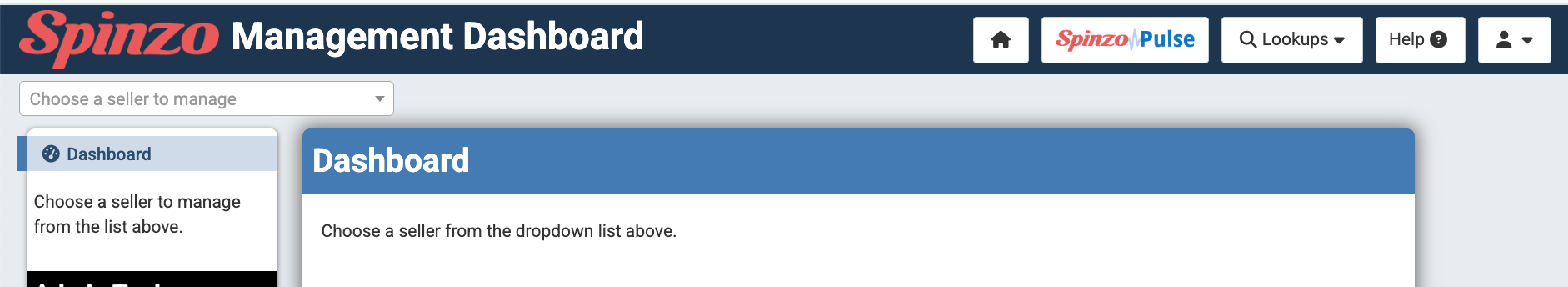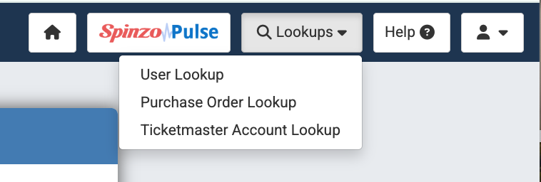 Step 1: On the top bar of the page, locate the "Lookups" tab. It is located toward the right side of the top blue bar in between "Spinzo Pulse" and the "Help" tab.