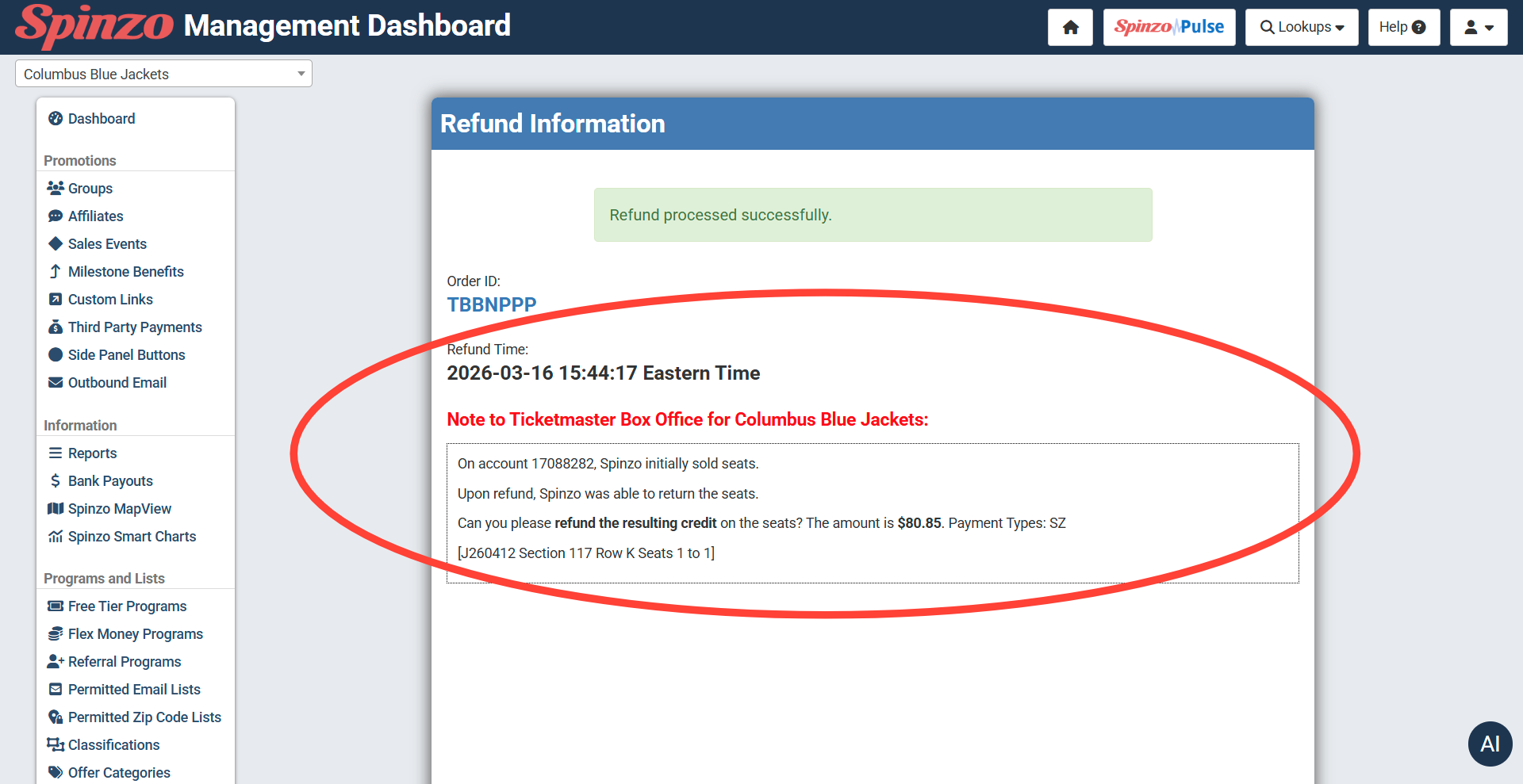 Step 3: Upon refunding, Spinzo will attempt to release the seats and will fully refund the buyer (ticket cost and fees). Once the refund is complete, all Archtics integrated orders will generate copy with the details of the Spinzo method payment that needs to be cleared from the account.