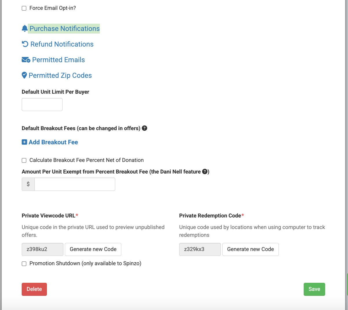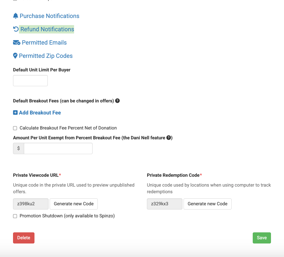 Spinzo offers a few options for notifications at multiple levels. The notifications include "Purchase Notifications," "Question Notifications," and "Refund Notifications." Each notification provides different information and can be opted into individually by a Spinzo user.
