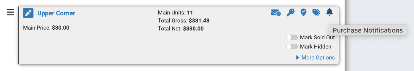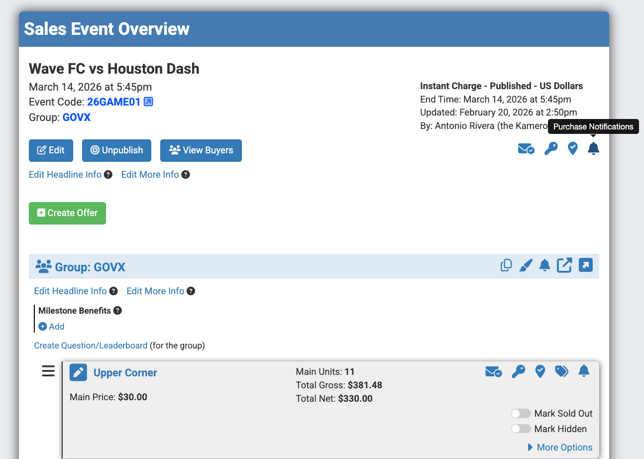Purchase notifications can be enabled at four levels: seller, group, sales event and offer. This means clients can choose to receive notifications for every order or just for a group, sales event, or offer/zone. To receive "Purchase Notifications," follow the steps below.
