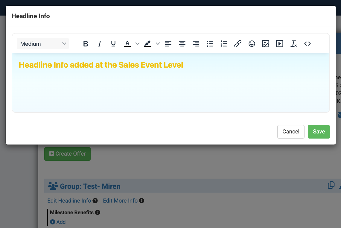 When adding "Headline Info" at the group level, it's important to note that this information will show up at all levels. It will show on the group link, sales event specific links, and an affiliate link.