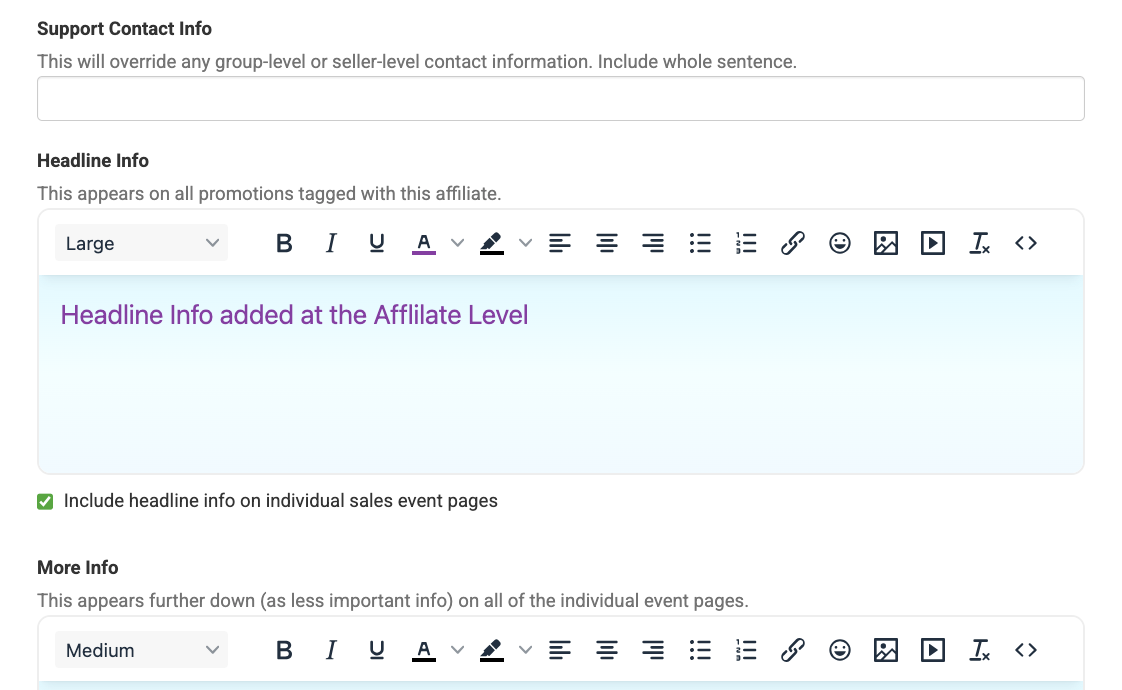Adding "Headline Info" at the affiliate level will add it to the specific affiliate link. It's important to note that if headline information has been added at the group level and at the sales event level, the information added at the affiliate level will show below that information. If there is no "Headline Info" at the group level or sales event level, then this information will be the main description of the page.